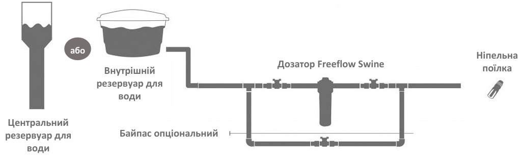 Дозатор Freeflow Swine слід встановлювати у легкодоступному місці, між резервуаром для води та поїлкою для тварин, один дозатор на приміщення або до 1200 тварин на відгодівлі. На інших етапах розрахунок базується на щоденному споживанні 15 000 літрів води.