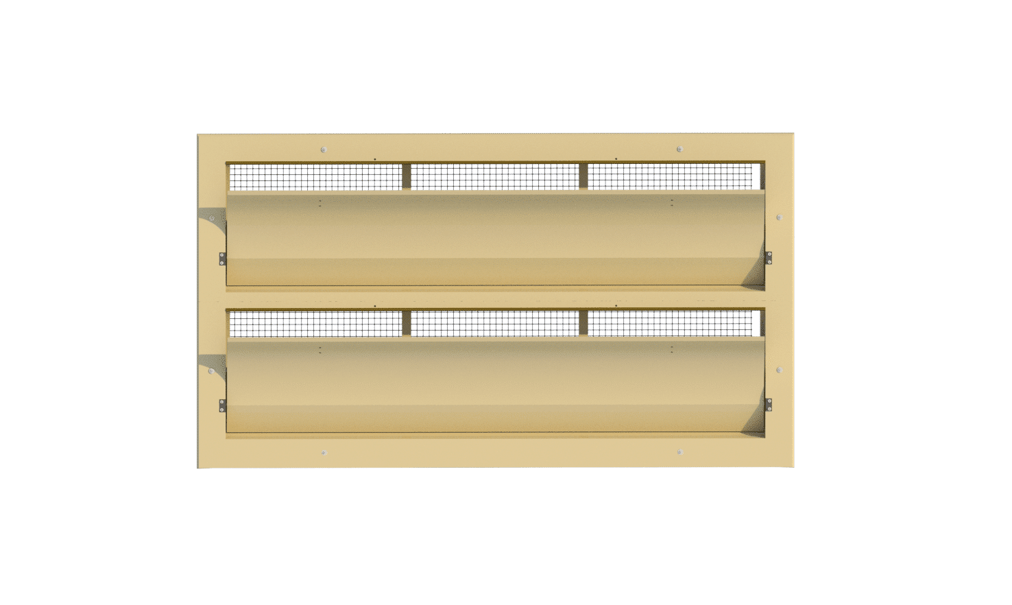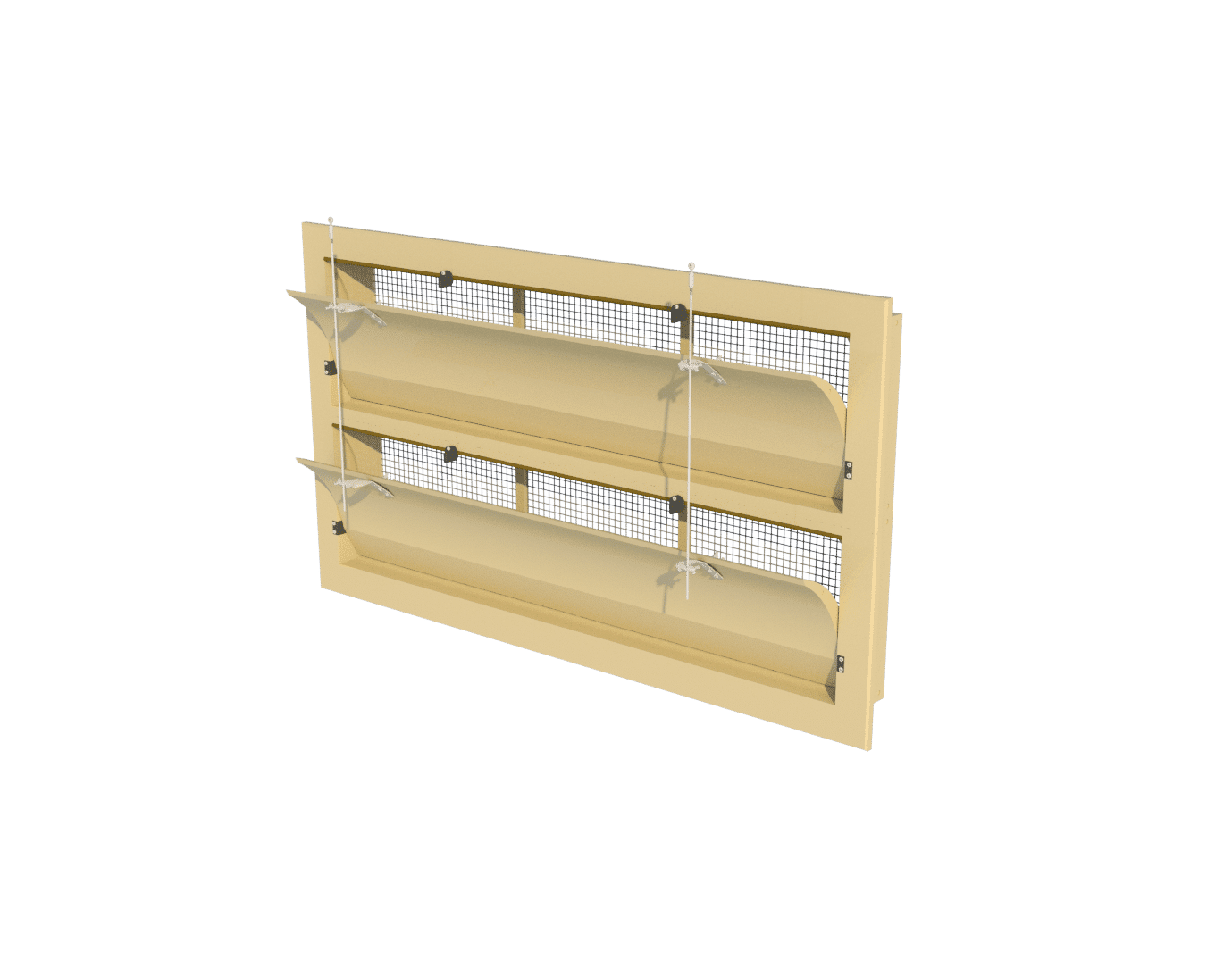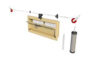 Приточный клапан с центральным шарниром. Этот приточный клапан с центральным шарниром разработан таким образом, что воздух может проходить также под внутренней заслонкой после открытия более чем на 35%. Это помогает направлять воздух вниз к животным и обеспечивать охлаждающий эффект во время максимальной вентиляции.