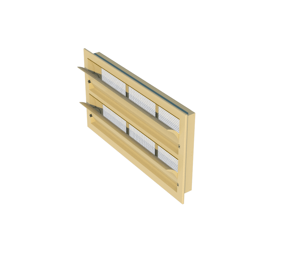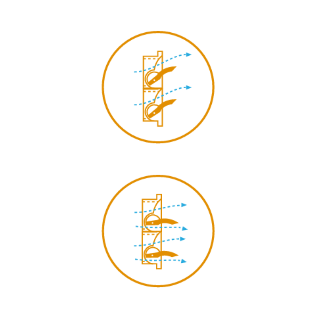 Изогнутая внутренняя заслонка. Этот приточный клапан оснащен изогнутой внутренней заслонкой. Изогнутые заслонки направляют воздух вверх при минимальной вентиляции, но также и вниз после определённой точки открытия. Это идеально подходит для помещений, где воздух должен быть направлен непосредственно к животным или над ними во время максимальной вентиляции.